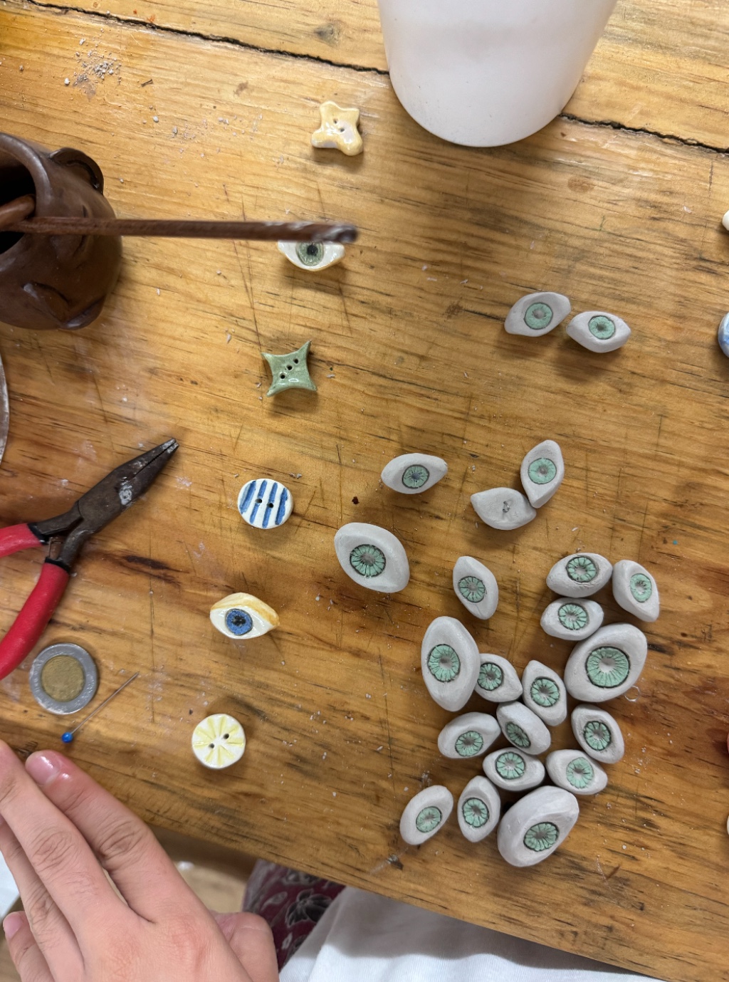 Nuestros botones nacen uno a uno, moldeados a mano, como pequeñas piezas de tiempo y cuidado. Los ojos observan, resguardan, reconocen; son intuición, presencia y verdad. Nos recuerdan que, aunque cada historia es distinta, es algo que compartimos casi todos: una forma íntima de presenciar la vida.
